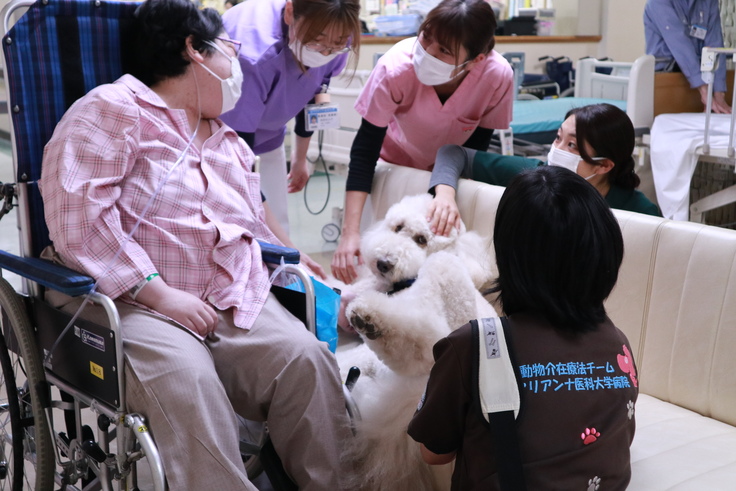 その間は苦痛の訴えもなく常に笑顔で溢れます。 辛い症状の中で治療の一歩を進めるために、勤務犬の訪問時間は自然に治療に向かいたくなり、苦痛を忘れられる、楽しみとなる、とても大切な時間になっていると感じます。
