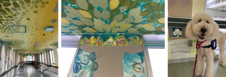 聖マリアンナ医科大学病院の本館と別館をつなぐ4階の30m程の渡り廊下に、似顔絵セラピスト村岡ケンイチ氏らによるホスピタルアートが描かれているのをご存じでしょうか。患者さんが癒され前向きな気持ちになれるようにと願いを込めて、聖マリスタッフの方々も加わり描かれたその中に勤務犬のミカとモリスも登場しています。今回は、村岡ケンイチ氏にご協力いただきその素敵な廊下に描かれたミカ&モリスをお届けできることになりました。