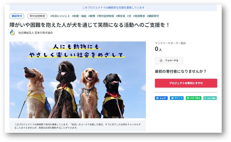 また、この度、日本介助犬協会はREADYFOR 継続寄付サービスを導入し、私たちの活動に継続的なご支援をしていただく方を募っています。ぜひあたたかい応援をお願いいたします。https://readyfor.jp/projects/jsda