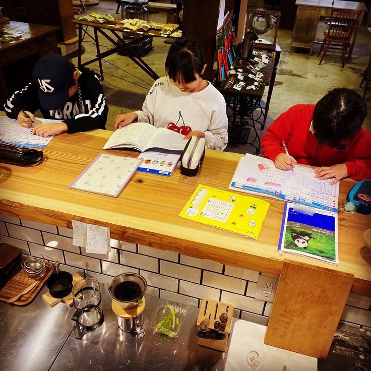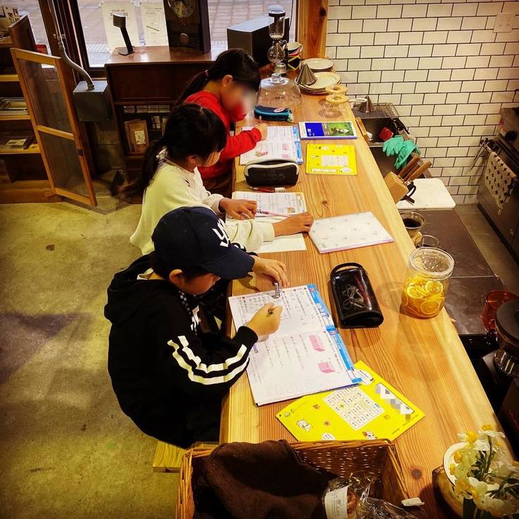 昨日は、息子の同級生が宿題を持ってお店に遊びに来てくれました。コレこれ。この光景。描いていた夢の一つが形になった様でとても嬉しかったです。
