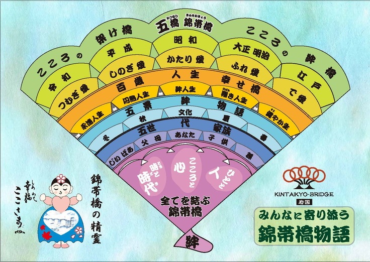 岩国の思いによって生まれた、山あり谷あり人生応援橋、ひとと人、こころと心、時と時代を結ぶ錦帯橋。