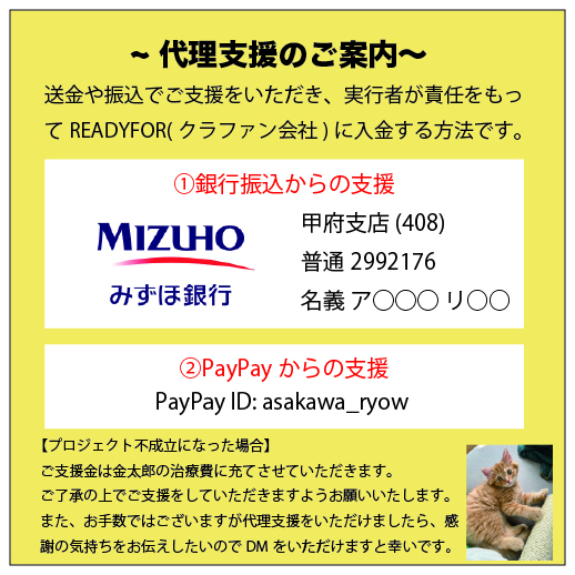 プロジェクト不成立になった場合のご支援金は金太郎の治療費に充てさせていただきます。ご了承の上でのご支援をよろしくお願いいたします。