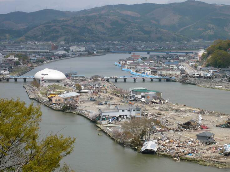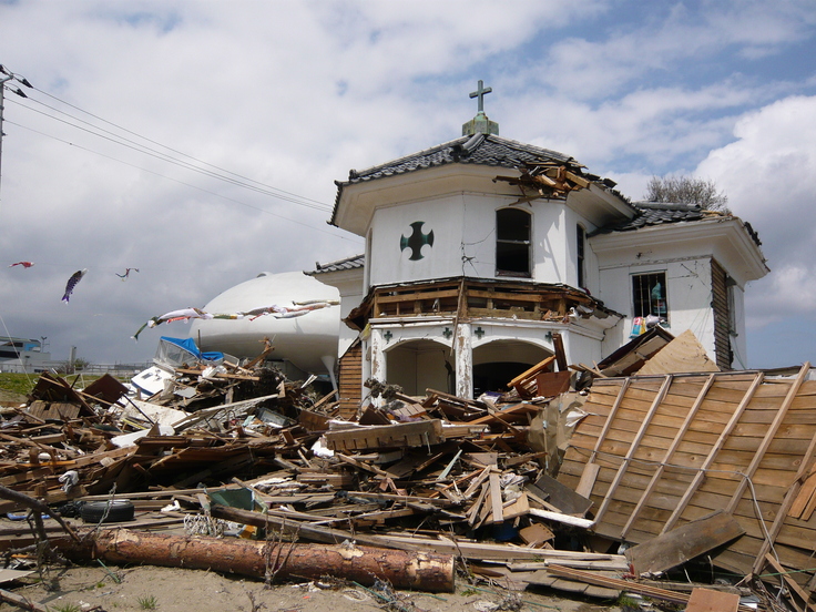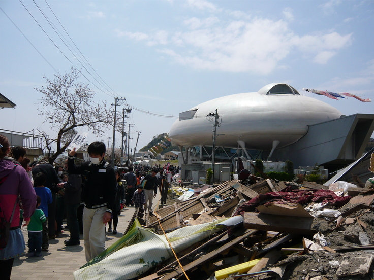 2011年3月11日午後2時46分に東日本大震災が発生、石巻市に大津波警報が発令されました。地震発生から約1時間後、旧北上川を遡上した津波に、萬画館は一気にのみこまれてしまったそうです。しかし、がれきが押し寄せたものの衝突は免れたそうです。丸いフォルムが瓦礫をかわしたのかもしれません。