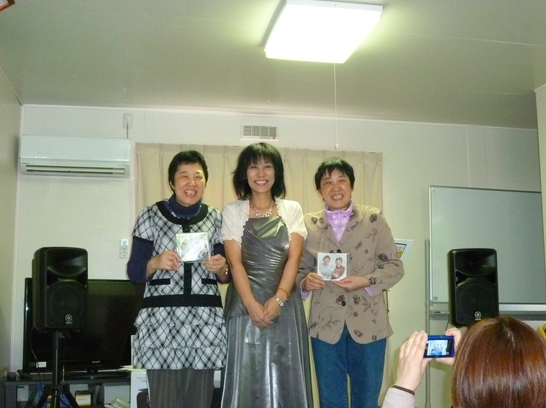 (陸前高田市細根沢仮設住宅集会所でコンサートをした時の写真です。CD「笑顔の花束」の作詞の吉田姉妹と一緒に映りました)