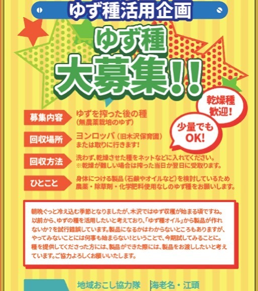 無農薬無化学肥料で栽培されたゆずの種限定で回収しており、オイルを使用した地元のおみやげ品作りを目指しています。