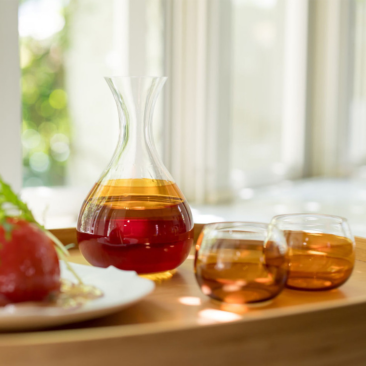 カラフェのグラデーションが織りなす線は、一番上から240ml、180ml(一合)、80mlを示しており、簡易計量もできるんです!ほろ酔い気分になれる量の冷酒を注いでおいたり、お酒だけじゃなくドレッシングを入れてテーブルに置いてみたり。いろんな便利な使い方ができます。