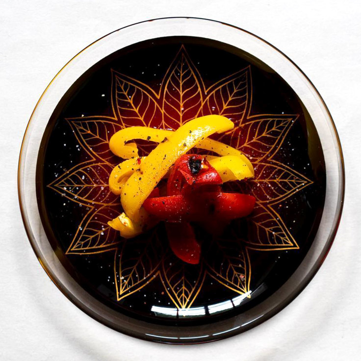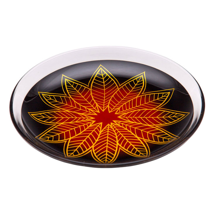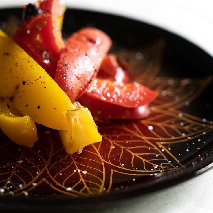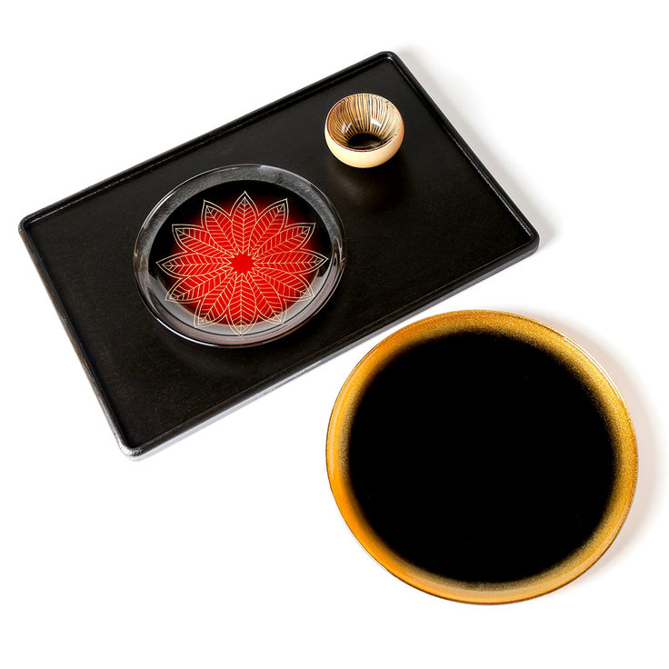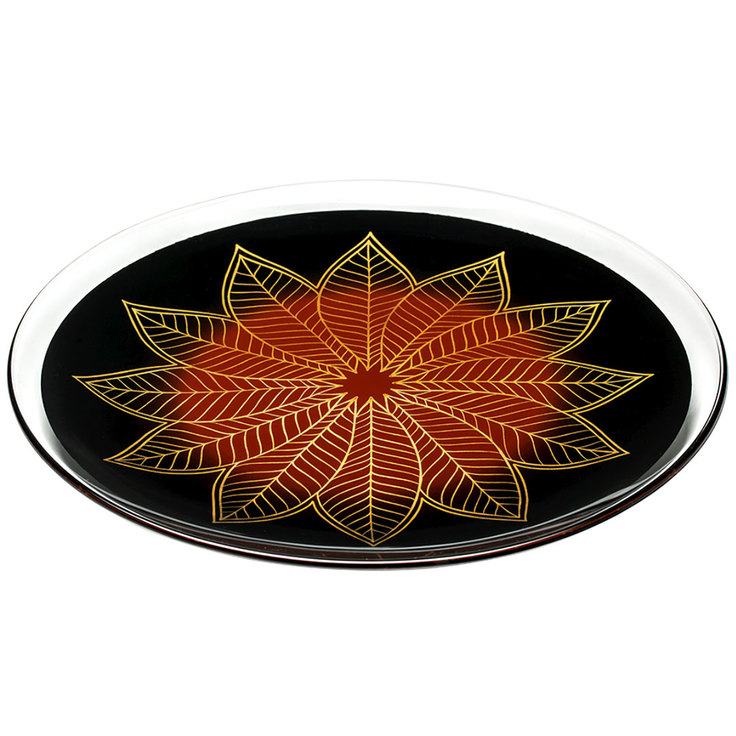 並べた葉っぱの上で料理を楽しむことをイメージしたプレート。日本の美意識を再解釈して施された漆の蒔絵とグラデーションが和に留まらない自由な使い方を提案する漆硝子です。