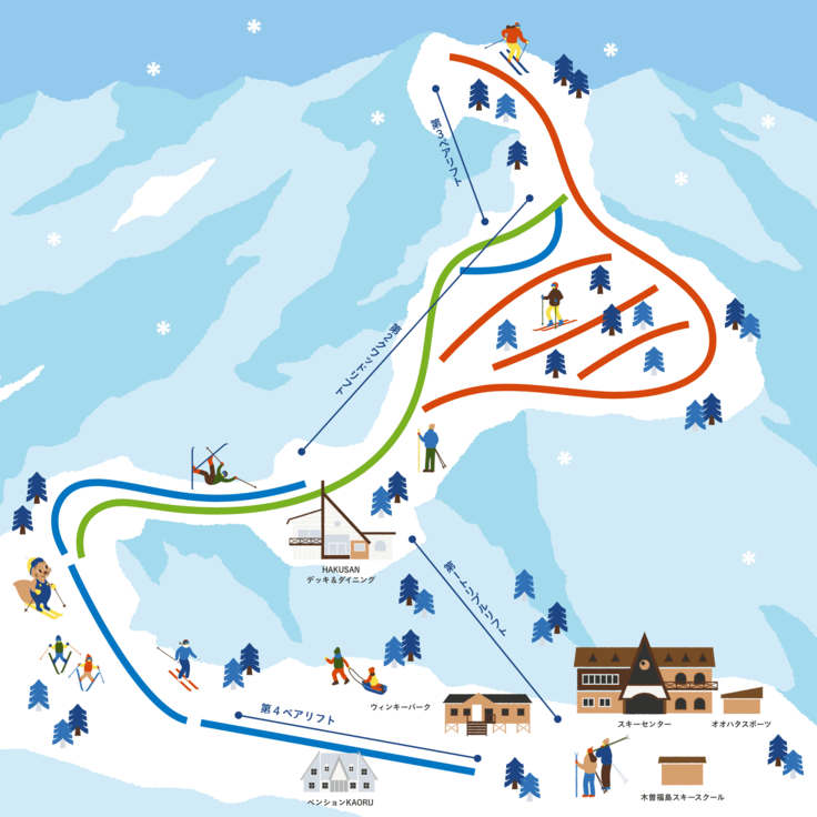 ゲレンデからは御嶽山を一望でき、ロケーションは抜群で、ゲレンデ上部は初級から上級向け5コース、中間から下部は初心者やファミリー向けゲレンデがあります。