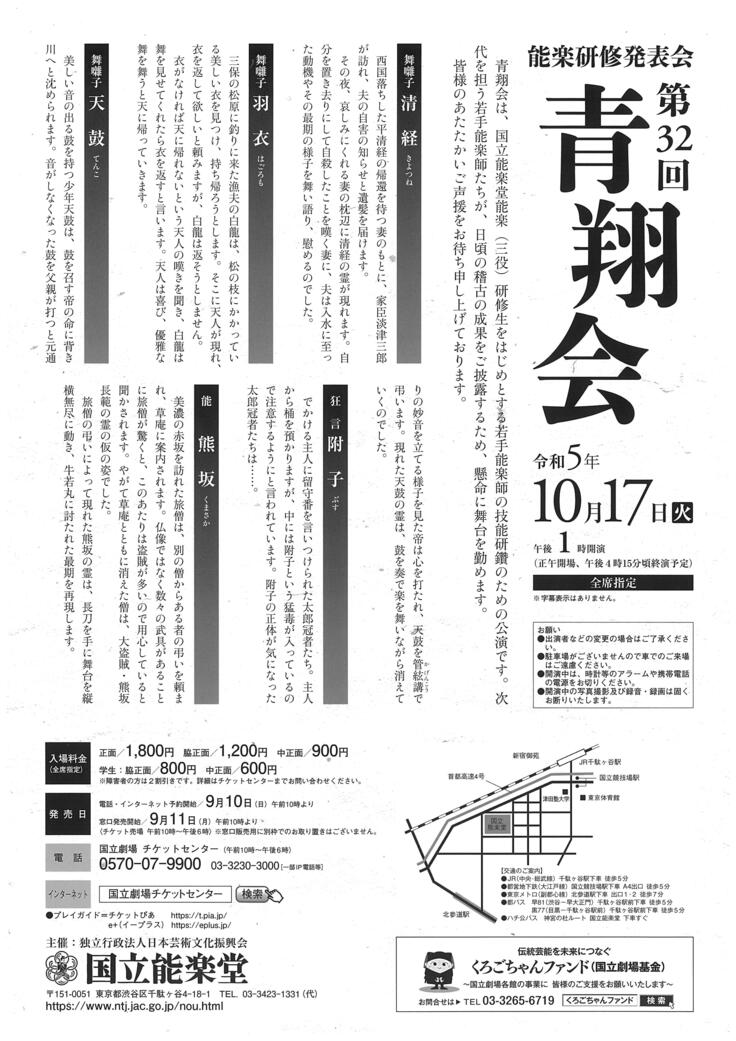 10月17日(火)能楽研修発表会『第32回 青翔会』が国立能楽堂にて開催されます。喜多流は佐々木多門が能『熊坂』を勤めます。そのほかに金春流、観世流、宝生流の舞囃子などもご覧いただけます。
