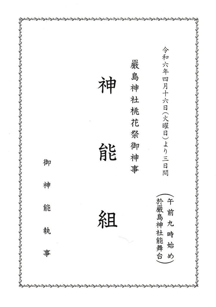 4月16日(火)~18日(木)広島の厳島神社能舞台にて「桃花祭御神能」が開催されます。