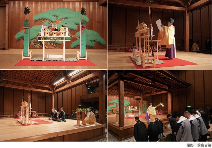 鏡板の松を前に祭壇を設け、下神明天祖神社宮司 福岡三朗様の祝詞奏上に続いて、喜多流能楽師による連吟奉納を行い、改修工事の安全を祈願いたしました。