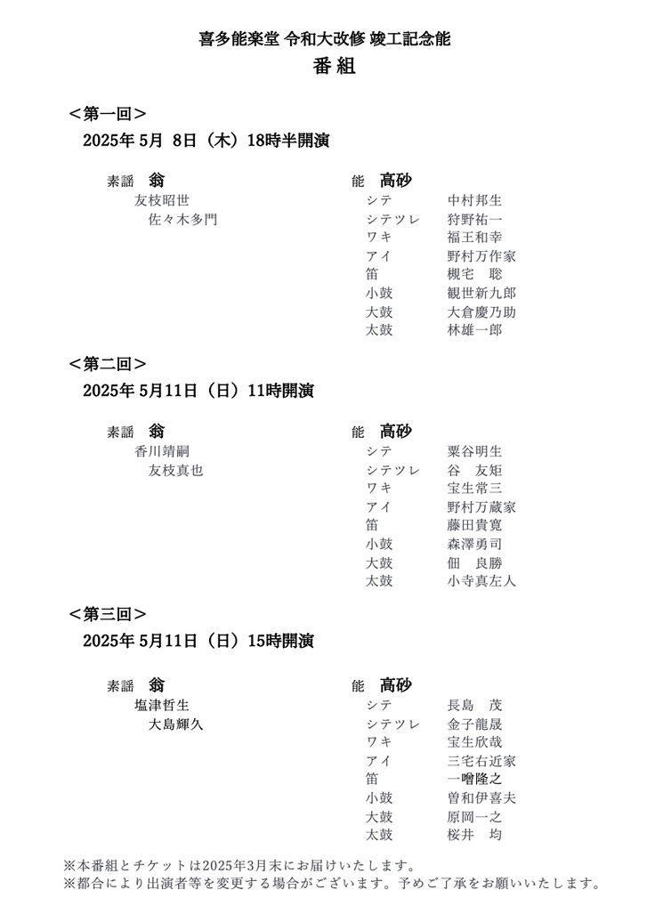 多くの皆さまよりご支援をいただきましたため、竣工記念能は三回に分けて開催いたします。