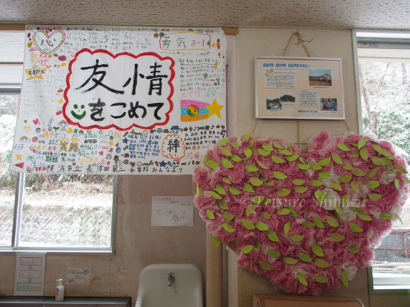 北上町内には北上小学校(震災後に旧橋浦小学校・旧吉浜小学校・旧相川小学校の3校が合併)がありますが、震災後に撮影するため校内に入ったところ、今度は見覚えのある小学校名が書かれた応援メッセージが。なんと、横浜にある僕の母校からでした。いや〜、もうなんて言ったら良いのかわかりません。