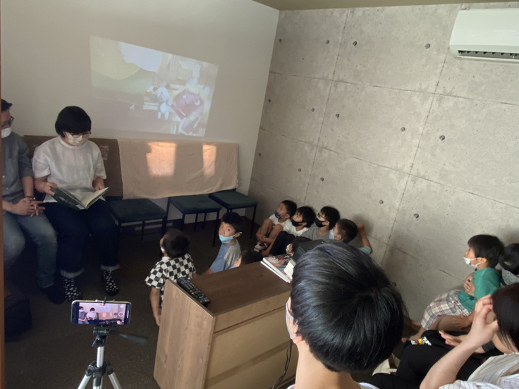 今回のイベントでは、リターン品で「えほんコンサートの絵本を読むことのできる権」を出していたので、ご家族や職員さんの子どもたちを集めて「ミニえほんコンサート」を行い、そこでピアノ演奏をバックに絵本を読んでいただくことにしたのです♪