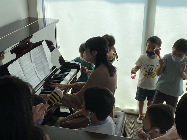 絵本が読み終わると、参加者のお一人がピアノを演奏してくださり、子どもたちは様々な楽器で一緒に大合奏♪♪♪