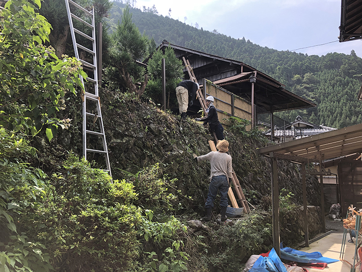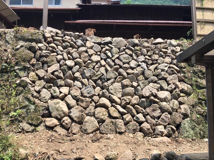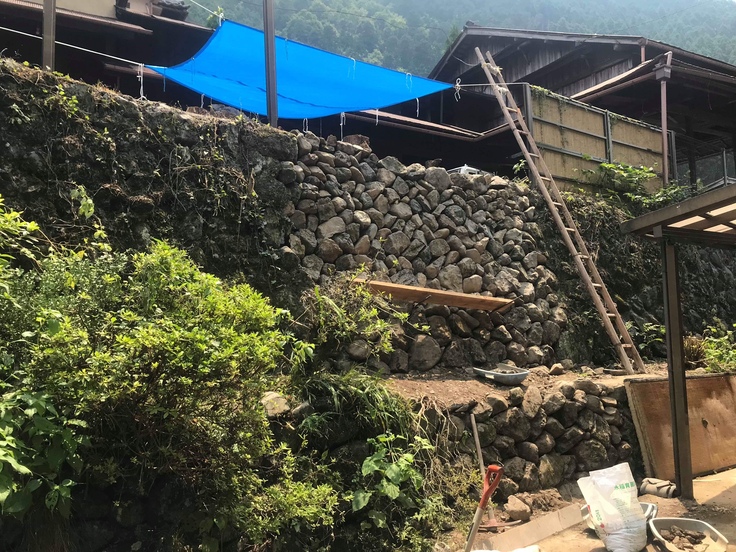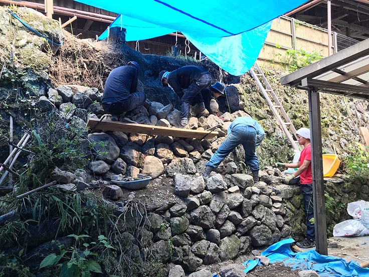 改修工事をはじめるにあたって、「まずは生活の基盤となる大地から!」ということで、石積みが少し膨らんでいた「谷側」との隣地境界の石積みの修繕を2019年7月に実施しました。