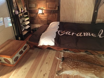 現在、海外の方にも人気のチョコレートの部屋には板チョコのベッド、チョコレートのパーテーション、板チョコの壁、レーズンサンドの机があり、都会の喧騒を忘れて魔女の宅急便のウルスラ(絵描きの女の子)の家のようなアトリエをイメージしています。ここに洗面所、お風呂、煙探知機などを付けて宿泊できるようなお部屋にしていきます。