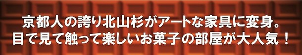 初めまして、北山杉を使った「お菓子の家具専門店」泡糖工房(カルメラこうぼう)の和田紗夕里です。北山杉の里「京北」にアトリエを構えて移り住み、お菓子の形をした家具を専門に制作しています。天然絞りの北山丸太を初めて見た時、なんて魅力的な素材なんだろう、そしてお菓子の家具にぴったり!(特にケーキのスポンジ部分を表現するのに笑)と感激したことを今でも覚えています。
