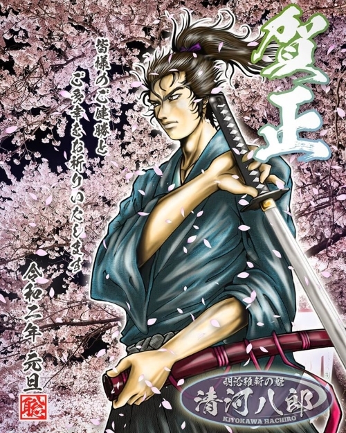 ■ 清河八郎をこよなく愛する方から素敵な年賀状を頂きました。「赤心報國回天倡始」(真心を持って国につくし自分が先頭になって行動を起こす)を信念に全国を駆け回った八郎の気迫ある姿と、「桜ばな たとえ散るともますらおの 袖ににおいをとどめざらめや」と亡き妻お蓮を詠んだ歌を重ね合わせた見事なイラストです。