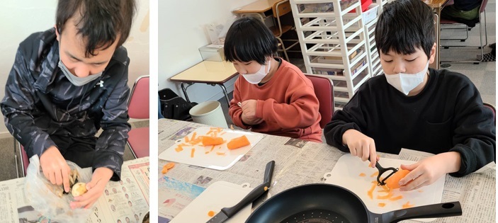 真剣に野菜の皮を剥く利用者さんたち🥕