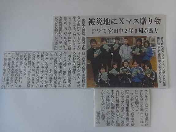 一昨年の震災当初、1年生の時から支援活動について学び、~きずな~に対しても、募金を集めたりシルバーカーを送るのに協力してくれました。