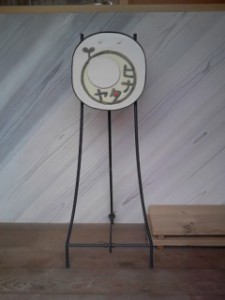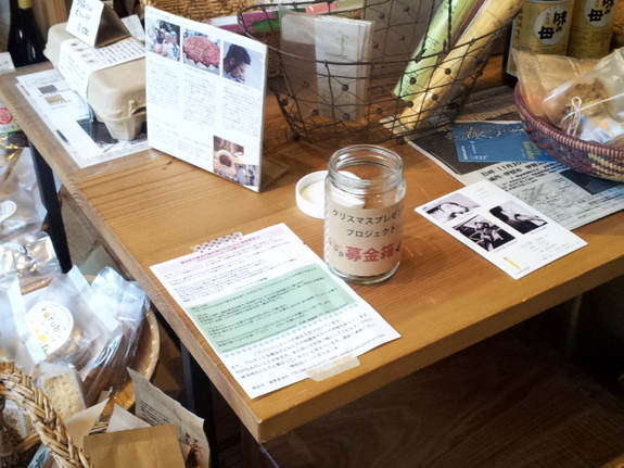 そして真ん中のテーブルには、宮原さんの作った案内と募金瓶が置かれていました。