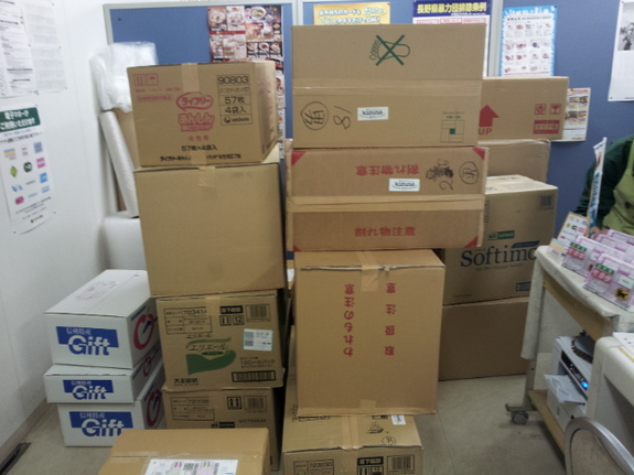 〈上は一人づつへのプレゼント、下は南相馬市へ発送した荷物です(16箱!)〉