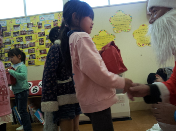 恥ずかしそうに下を向きながらプレゼントをもらっていく子