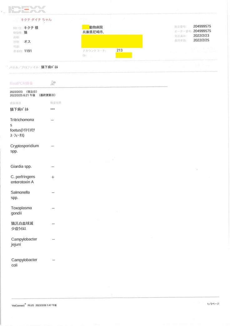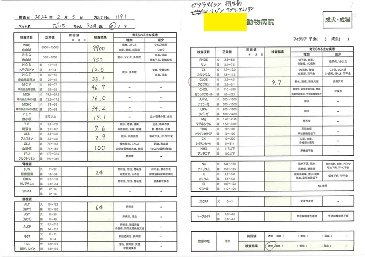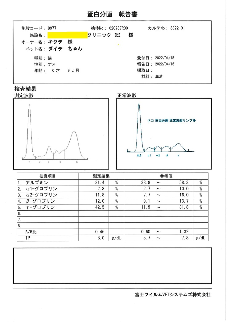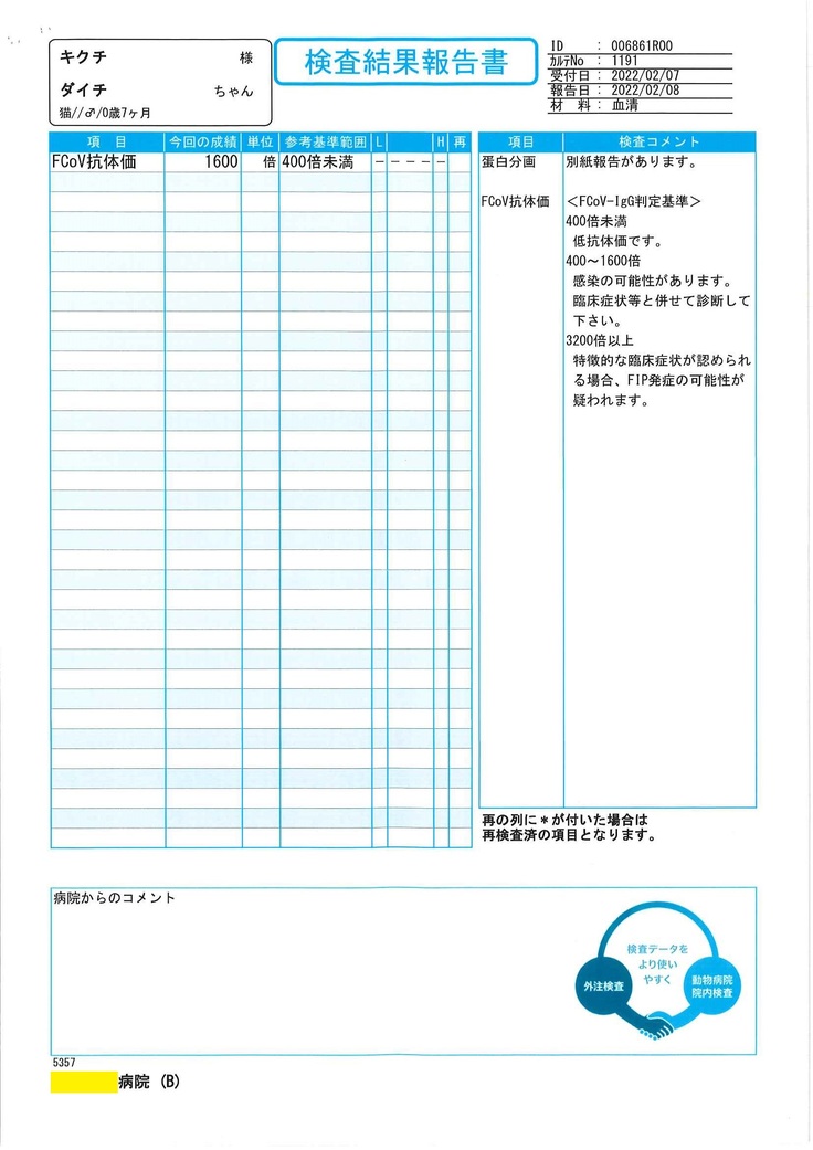 - 2022年2月の血液検査(猫コロナウィルス… FCoV抗体価:1,600倍…FIP特定に至らず)
