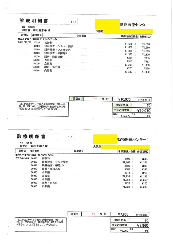 (3)眼科専門の動物病院(正式譲渡後:2022年1月~4月)