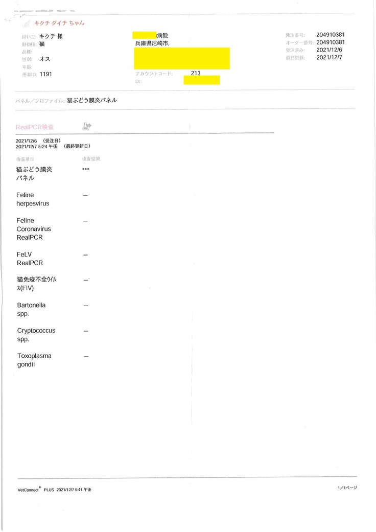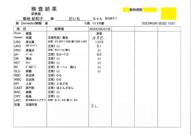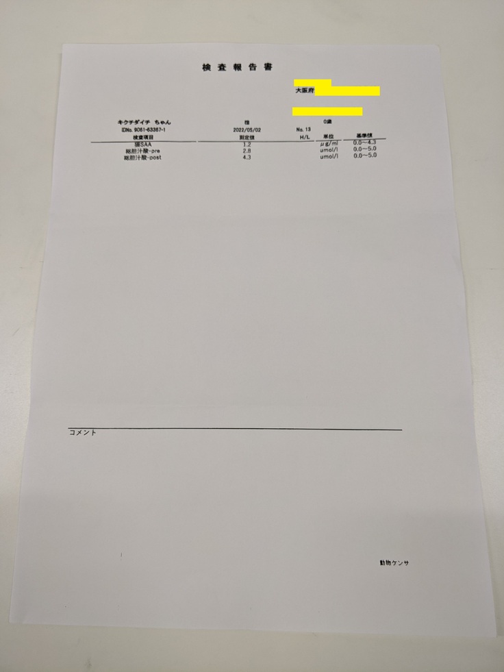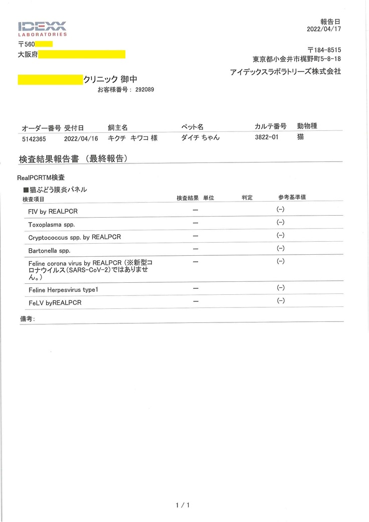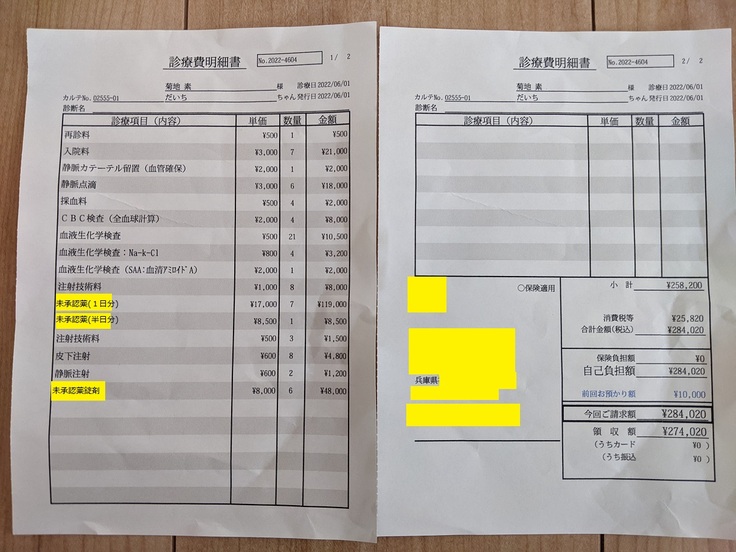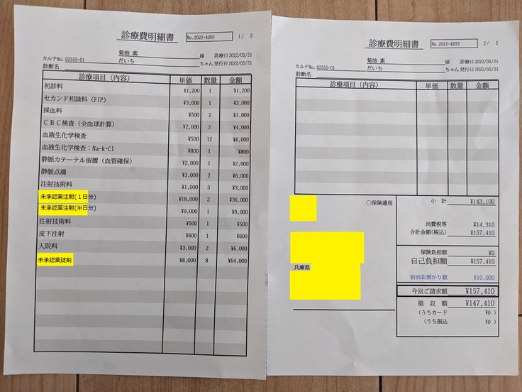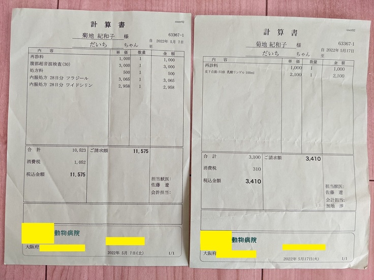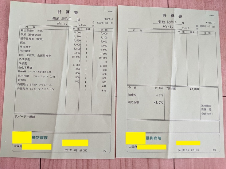 また、動物病院を受診しているのは妻のため、掲載している診療明細書・計算書や検査結果報告書は妻の名前で発行されているものが含まれています。