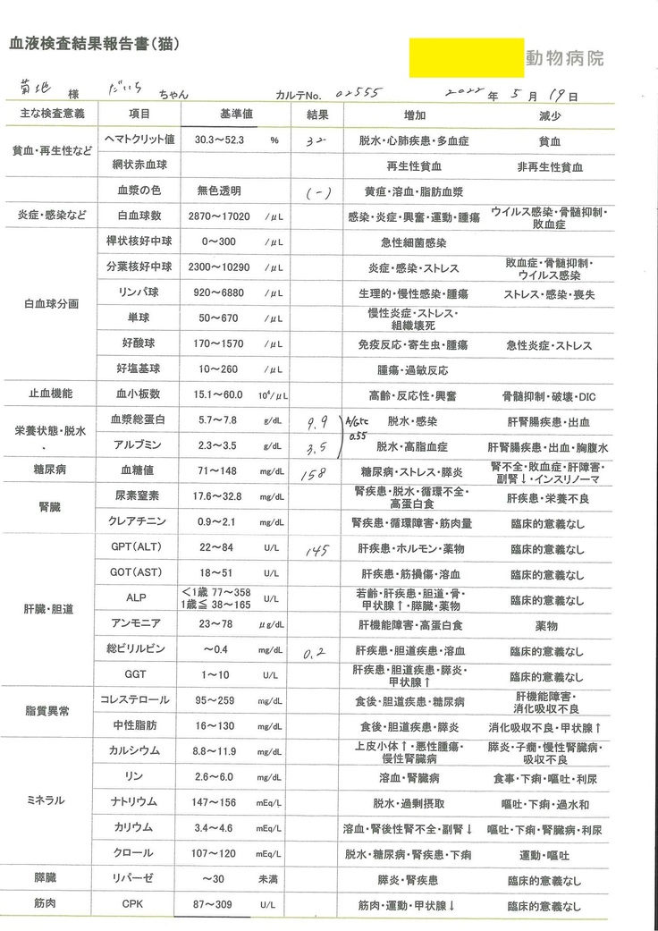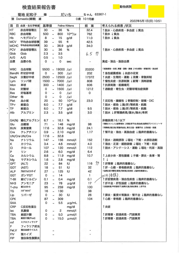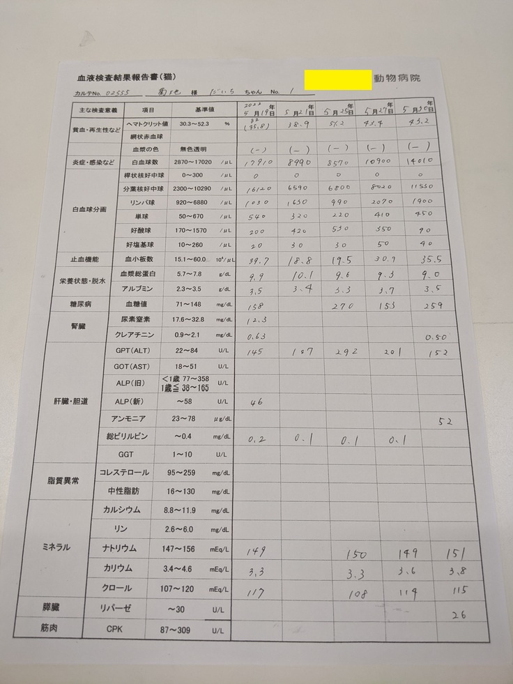 - 病気の原因を調べる為、度重なる血液検査。FIPを想定しながら実施するも特定するには難しいようでした。