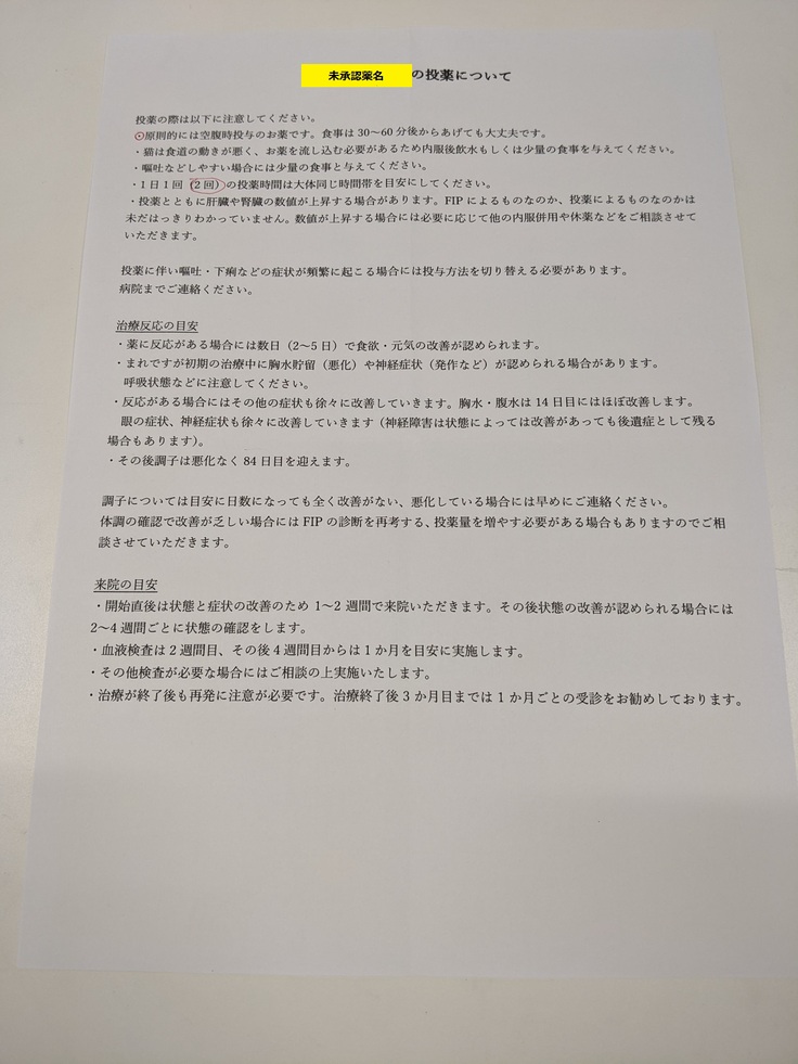 - FIPという恐ろしい病気の詳細と治療には、84日間にわたって特定の投薬をすること以外に手段はないと説明を頂きました。しかし、その薬は現時点では未承認の薬で最終的な寛解も100%保証できるものではないこと。非常に高価で費用は約100万円とのこと。情けないことに即答することが出来ませんでした。