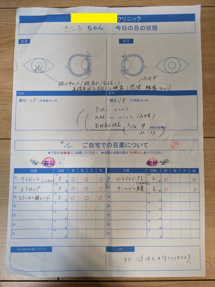 - 2022年4月、全身麻酔をかけて眼の中の眼房水を抜いて直接原因を調べる検査