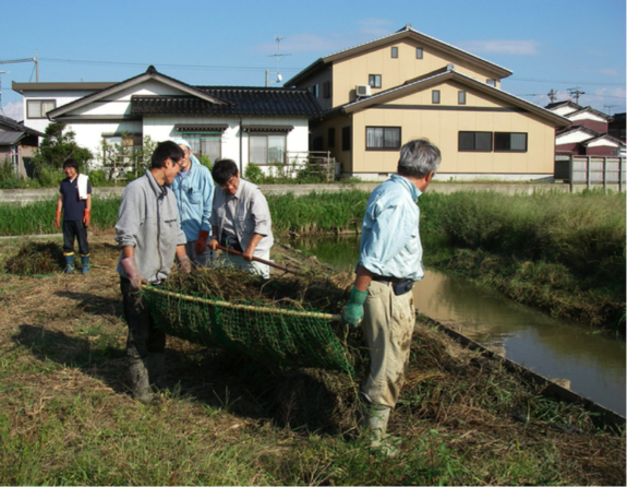 (水路保全の活動は毎年継続され、行政や土地改良区、農家、地域らが参加するかたちで進められています。)