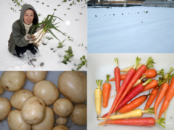 雪の中から収穫した野菜は、とっても甘くなっています。