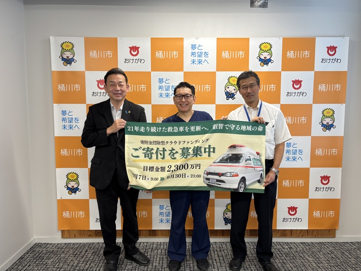 本日、救急科の田村副部長と阿古病院長が桶川市役所を訪問し、小野克典桶川市長や市役所職員の皆さまへ、