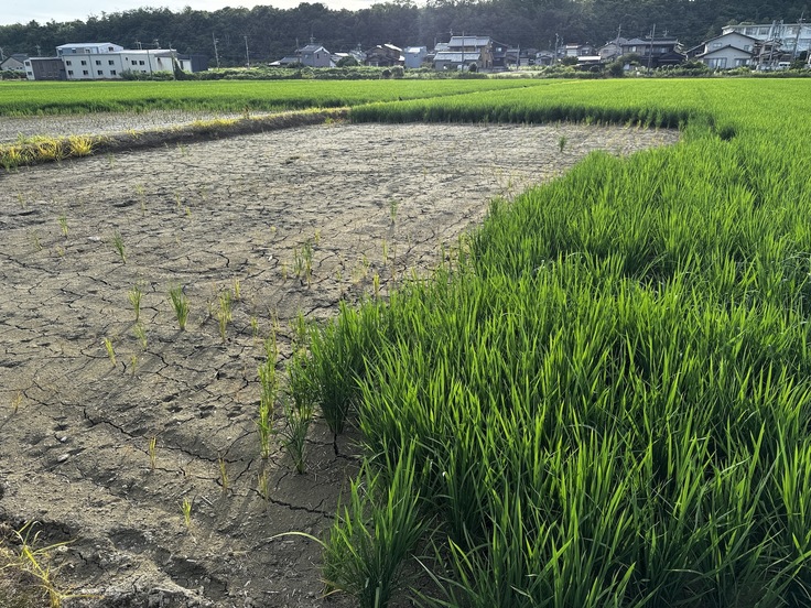 本年度は、大きな修繕工事後初めての作付で、これまで通りの順調な作付は叶わず、田んぼの一部では稲が十分に成長しない箇所も見られます。さらに、近日の豪雨により一部の稲が倒れる被害もありました。