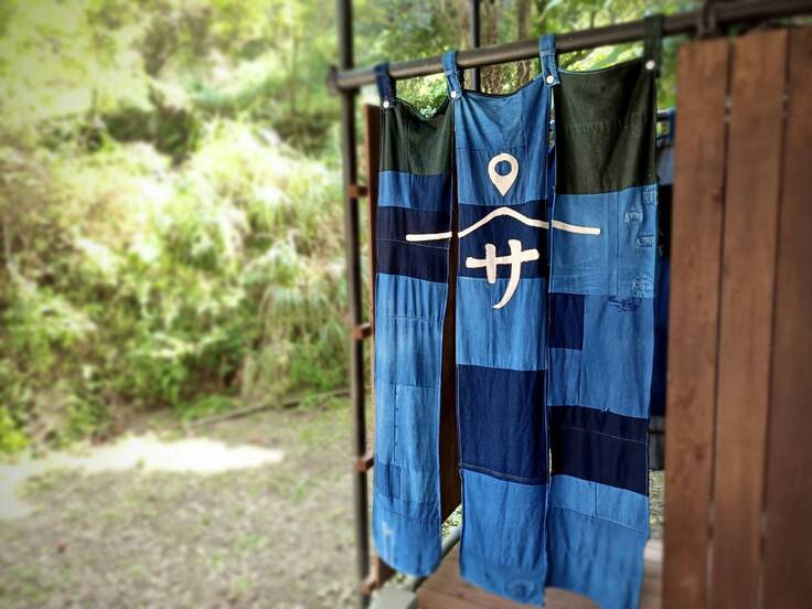 こののれんは、使われなくなった古着のデニムをほどき、丁寧につなぎ合わせ、藍で染め直した一点もの。