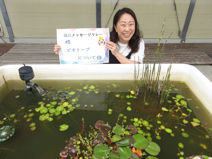 ビオトープとは,「地域の野生の生きものがくらす場所」という意味です。今は失われつつある昔の日本の田んぼや池をイメージして,2013年に設置しました。職員も初めてのことだったので,ビオトープに詳しい理事長先生から色々教えていただきながら今年で11年目となります。