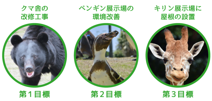 第2目標として「ペンギン展示場の環境改善」、第3目標として「キリン展示場の屋根の設置」を目指しているので、ぜひとも応援よろしくお願い致します。