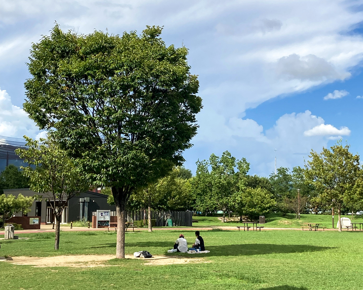 実際、この木陰に入る行為は理に叶っているもので、樹木がつくる影「木陰」には、「地表面の温度上昇を抑える」、「体感温度を下げる」、「蒸発散による周辺気温上昇を抑える」効果があり、特に体感温度では、約7度違うといわれています※。※まちなかの暑さ対策ガイドライン|環境省(令和4年)