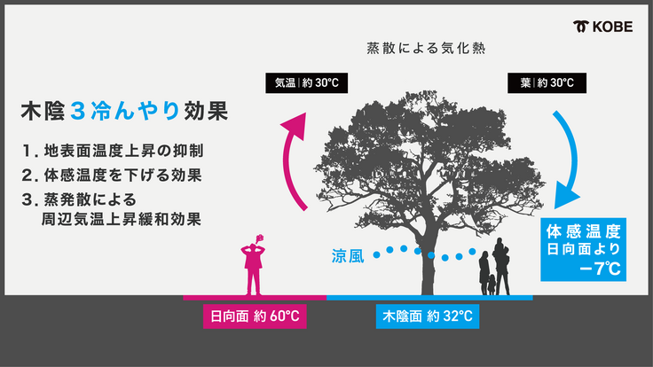話を取り組みに戻します。今回は、この冷却効果に着目し、神戸の中心部「三宮・元町界隈」に「木陰」をつくります。