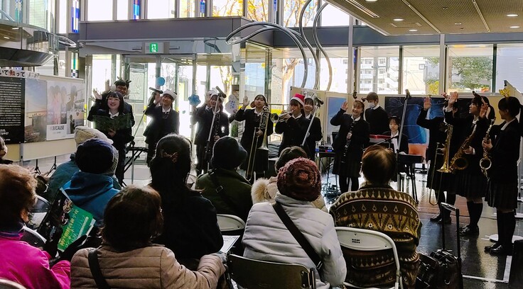 21日の神戸朝鮮吹奏学部によるミニコンサートには地元の方々や神戸朝高校生の皆さんが集まっていただき、クリスマスソングや吹奏楽部のオリジナルソングなどをお楽しみいただきました。最後は当会オリジナルソング「ヒマンエパラム 希望の風」を吹奏楽部の皆さんとともに歌うことができ、素晴らしい時間となりました。