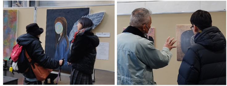 2日間にわたって展示した朝高美術部生による作品には、老若男女問わず、食い入るように鑑賞されている方々が多くおられました。作品を創った生徒さん本人に質問したり、創作時の気持ちを訊くことができるとても贅沢な作品展でした。