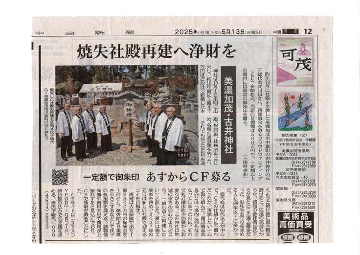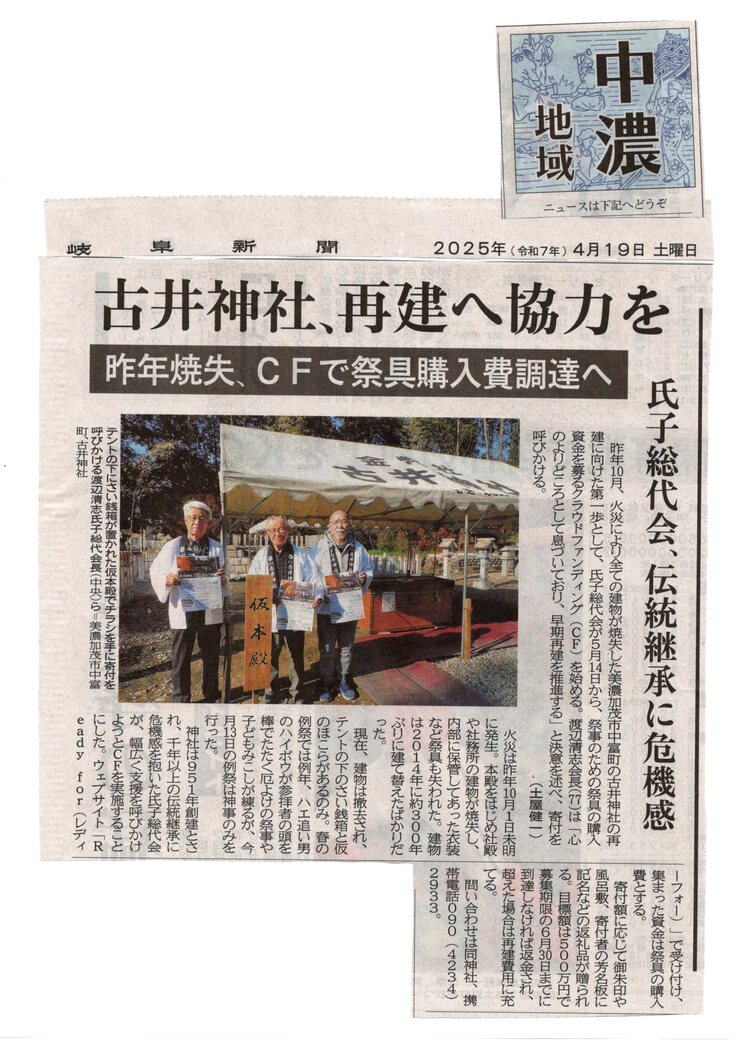 古井神社クラウドファンディングにチャレンジする活動が、中日新聞(5月13日朝刊)、岐阜新聞(4月19日朝刊)の記事として掲載されました。