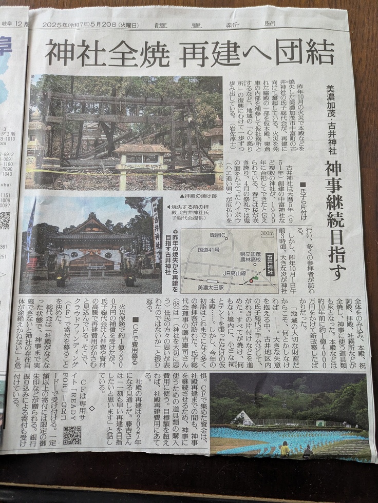 新たに5月20日の読売新聞朝刊(岐阜地方版)に古井神社再建に向けたクラウド挑戦の記事が掲載されました。