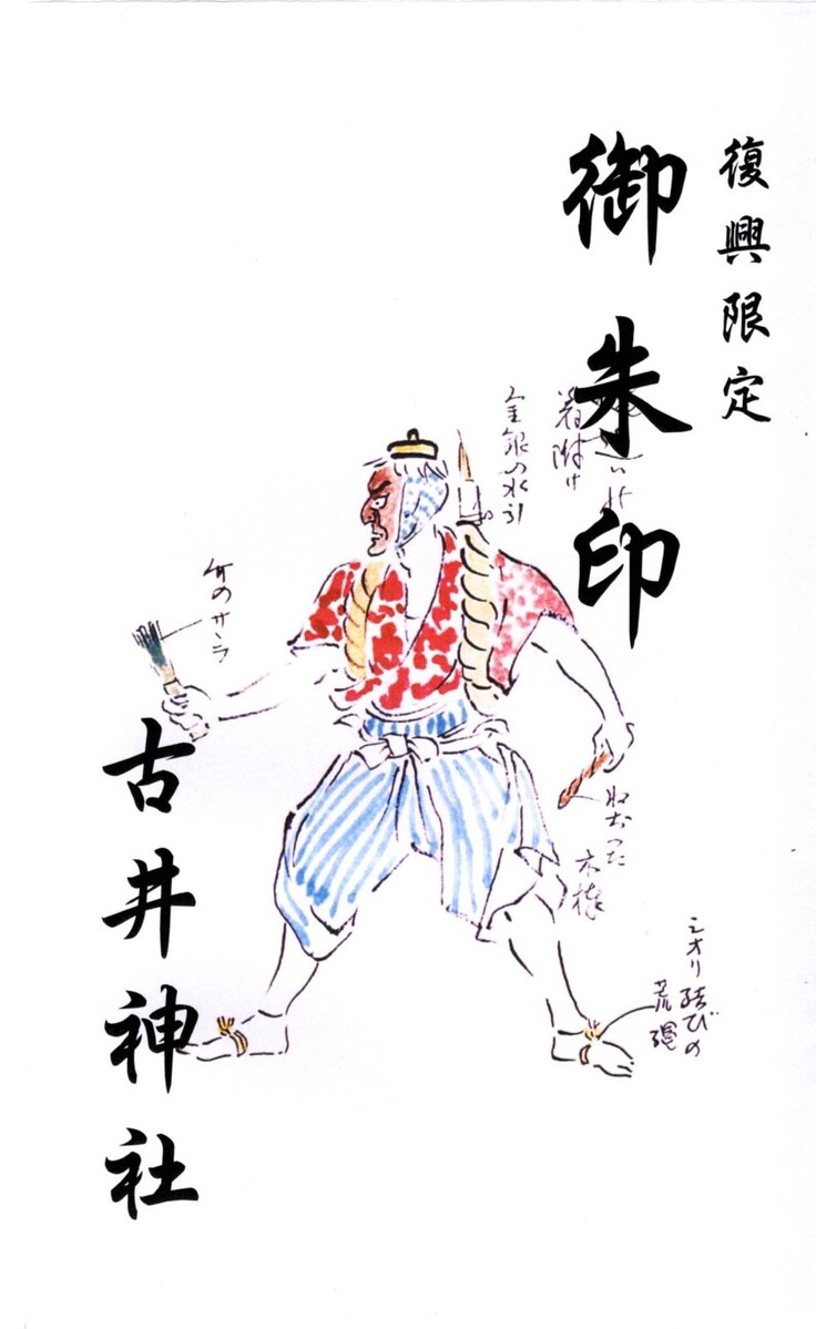 下古井では7年に一度、上古井では13年に一度の当元輪番で、なおかつ、当元内でも各自治会を順に引き継ぐことから、28年に一度あるいは39年に一度の当元の際に厄年の男性は、言い過ぎかもしれませんが奇跡的な確率です。私も44年前に偶然ですが、自分の自治会が当元に当たり、その際に25歳の厄年であったために、とても貴重な蠅追い役を担いました。古井地区にお住いの皆様の厄を一手に背負い、神前においてその厄を祓うのが神男の役目です。そんな貴重な姿をこの御朱印に託し皆様の幸せを願いおすそ分けするものです。
