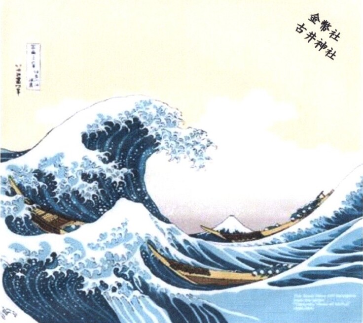 二つ目に用意しました記念の風呂敷ですが、絵そのものは「富嶽三十六景 神奈川浪裏」をそのまま引用しています。このデザインを選択したのは、今回の古井神社社殿等の火災全焼による焼失という大波を受け、船に乗った古井神社の氏子総代が、必死にもがきながらも新社殿を富士に見立てて突き進み、見事再建復興を誓うのに相応しいとの願いから選定しました。