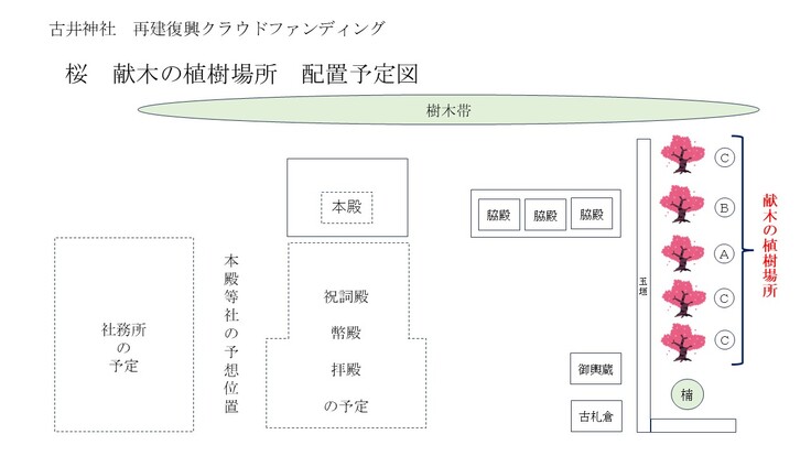 本殿等社殿の正確な配置がまだ確定しておりませんが、本殿東側の脇殿から南に向かって、玉垣沿いにA、B、C、C、Cと5本分の場所を予定しております。建物の完成後に献木のご支援をいただきました皆様をお招きして植樹式を行う予定にしております。桜の木にはご指名札も掲げてご披露もいたしますので、ご来訪の際にご確認ください。長くご披露させていただきます。